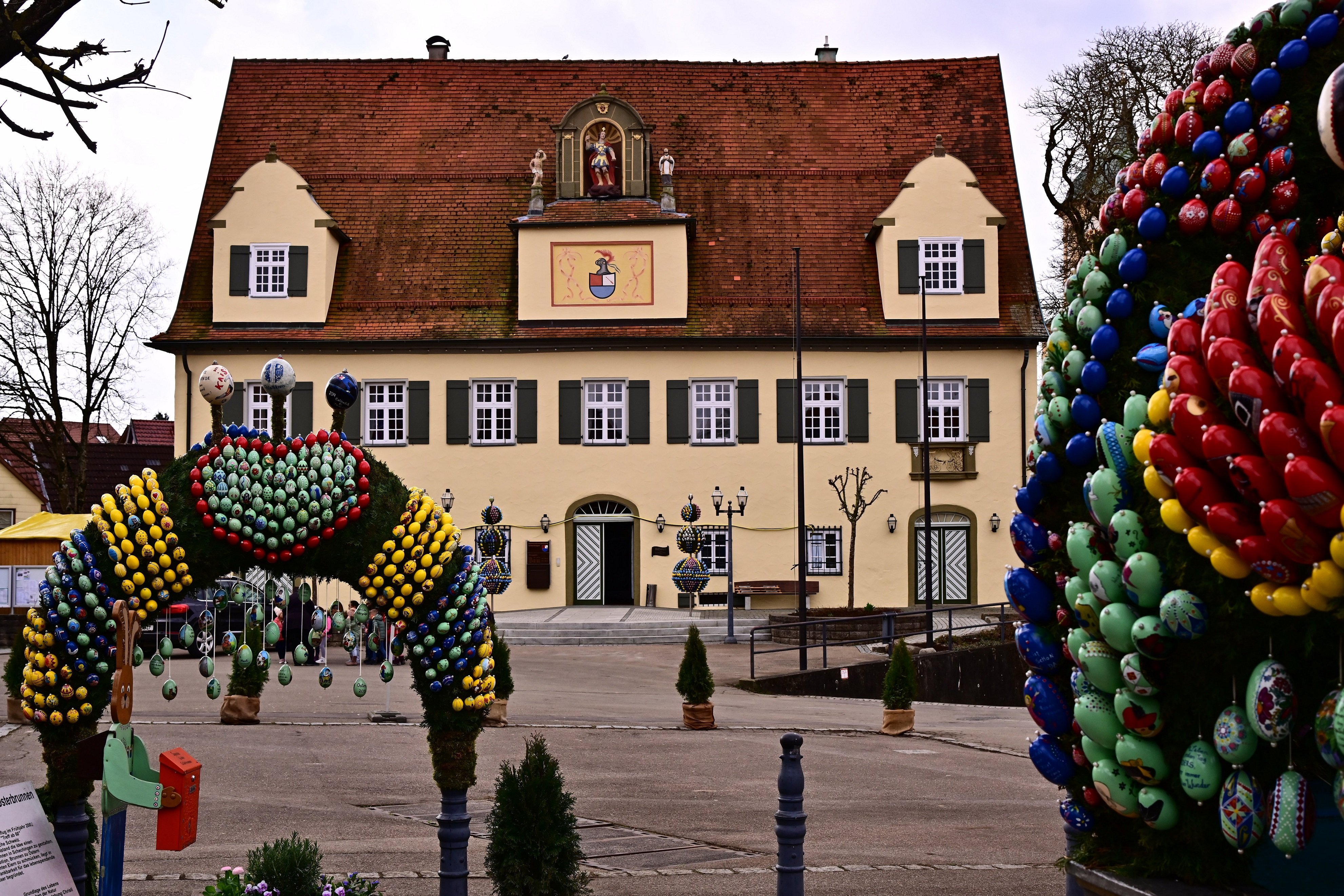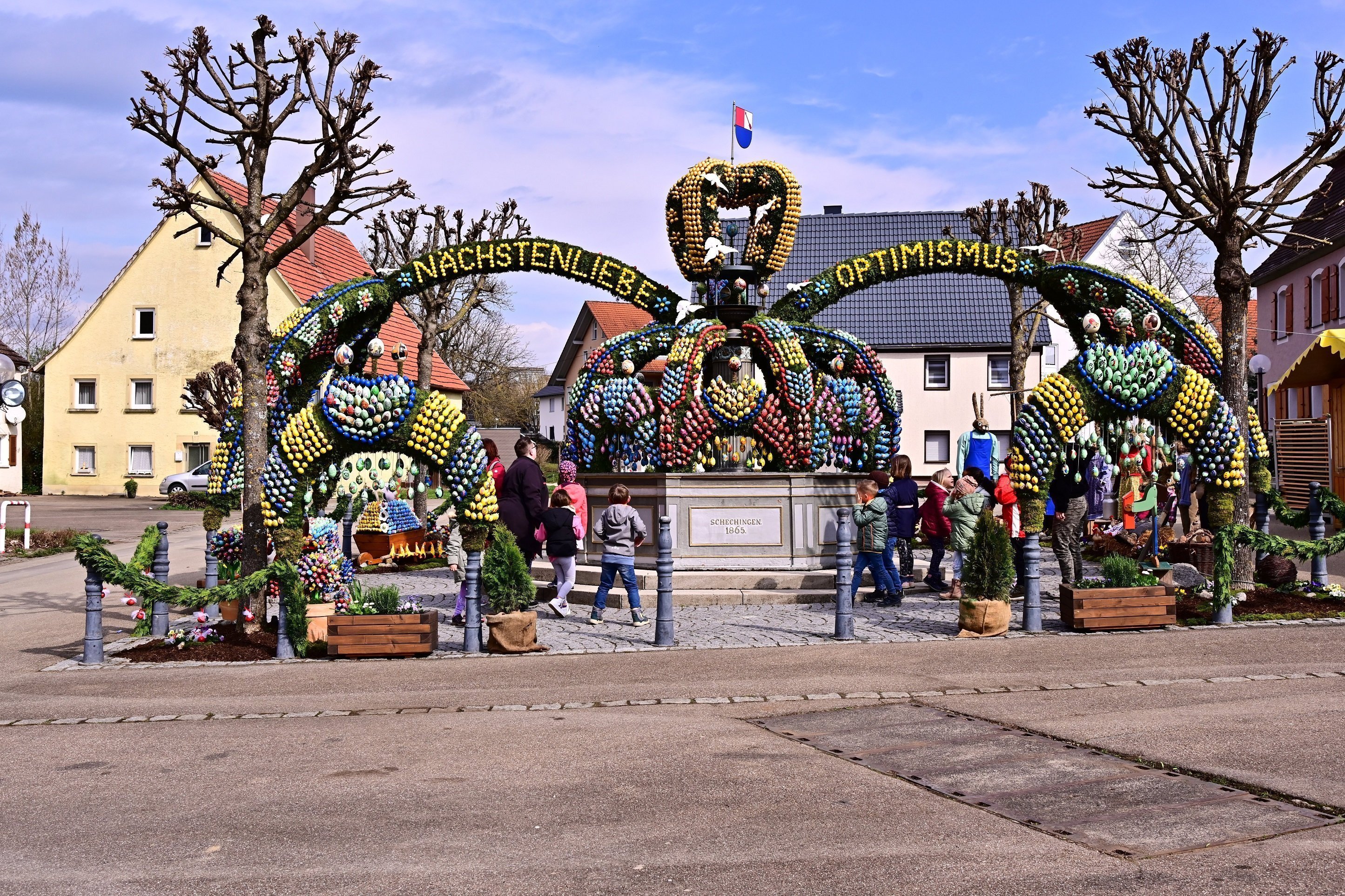 In Schechingen wird der Marktplatzbrunnen zur Osterzeit für ca. 3 Wochen mit über 12.000 echten und handbemalten Hühner-, Gänse-, Straußen- und Wachteleiern geschmückt und der Öffentlichkeit kostenlos präsentiert. Inspiriert von einem Ausflug unserer Seniorengemeinschaft „Treff ab 60“ in die fränkische Schweiz entstand die Idee, unseren historischen Brunnen aus Dankbarkeit für das lebensspendende Wasser, aus Freude am Erwachen der Natur und zum Fest der Auferstehung Christi mit bunten Eiern zu schmücken.