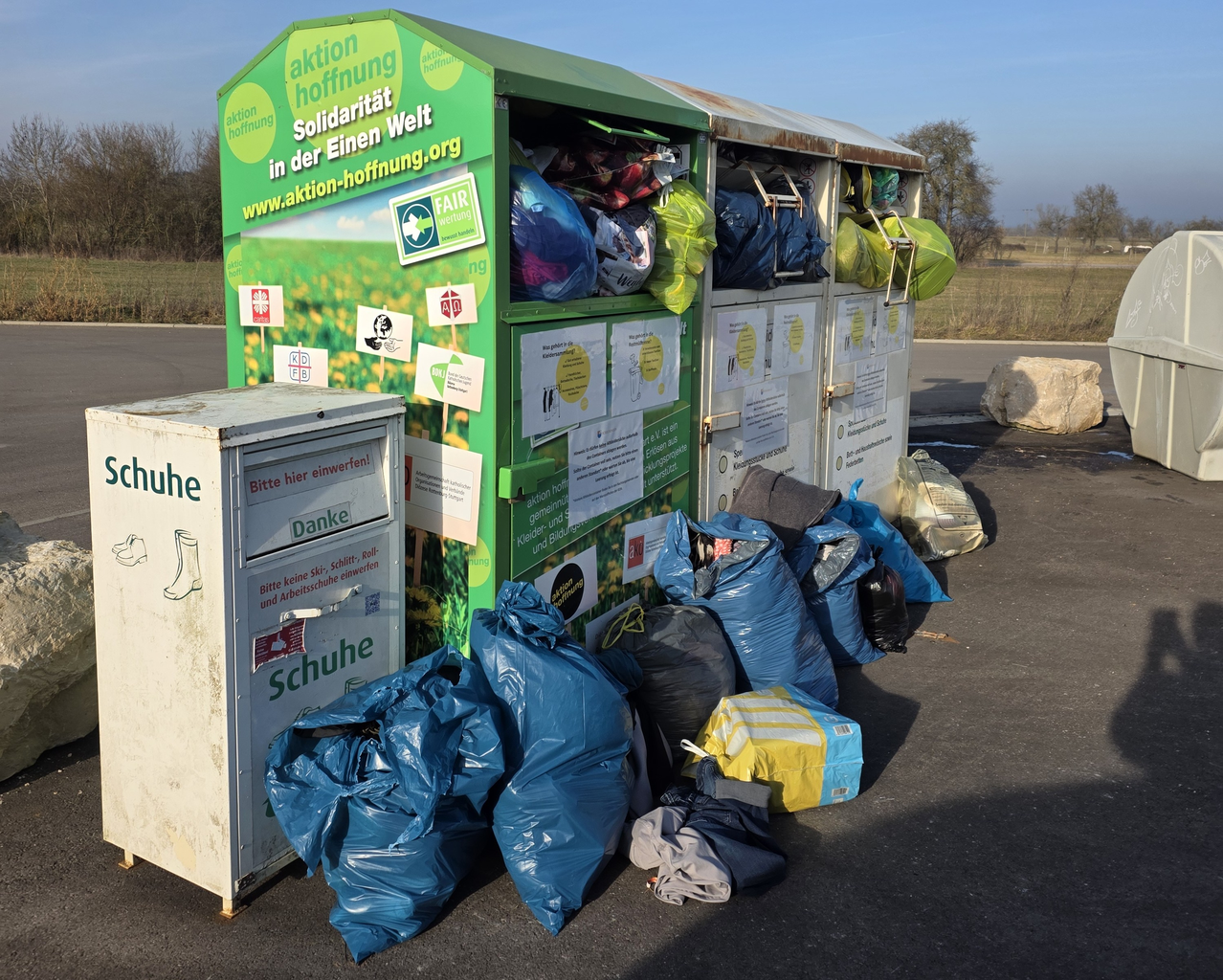 Das Sammeln von Altkleidern ist aktuell wirtschaftlich kaum noch möglich, da der Markt dafür eingebrochen ist. Es wird viel zu viel billige Kleidung produziert, welche nach wenigen Male tragen wieder entsorgt wird. Dies sorgt nicht nur für riesige Altkleiderberge in Europa, sondern hat auch den Markt in Afrika – auf welchem bisher ein Großteil der getragenen Kleidung aus Europa weiterverwendet wurde – überschwemmt.Wir sind dankbar, dass die Aktion Hoffnung der Diözese Rottenburg-Stuttgart die drei Container in Schechingen trotzdem noch nicht abgebaut hat. Wir sind auch regelmäßig im Austausch, wie sich die Leerung optimieren lässt. Was jedoch nicht geht: Wenn die Container voll sind, dürfen Säcke nicht einfach außerhalb abgelegt werden. Entweder die Entsorger suchen einen anderen Standort auf oder warten, bis die Container bei uns wieder leer sind. Ansonsten kann es passieren, dass die Container über kurz oder lang weg sind. Vielen Dank für die Unterstützung.