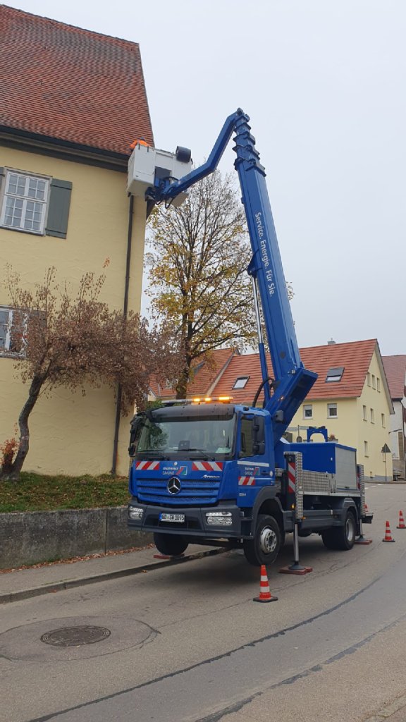Im Zuge der turnusmäßigen Überprüfung der Straßenbeleuchtung haben die Stadtwerke Schwäbisch Gmünd den Gemeindebauhof in der vergangenen Woche bei der Reinigung der Dachrinnen des Rathauses unterstützt. Für diese Arbeit wird ein Hubsteiger mit ausreichend langem Ausleger benötigt, welcher im Bauhof nicht zur Verfügung steht. Die Stadtwerke konnten hier mit ihrem Fahrzeug aushelfen. Ein herzliches Dankeschön hierfür.
