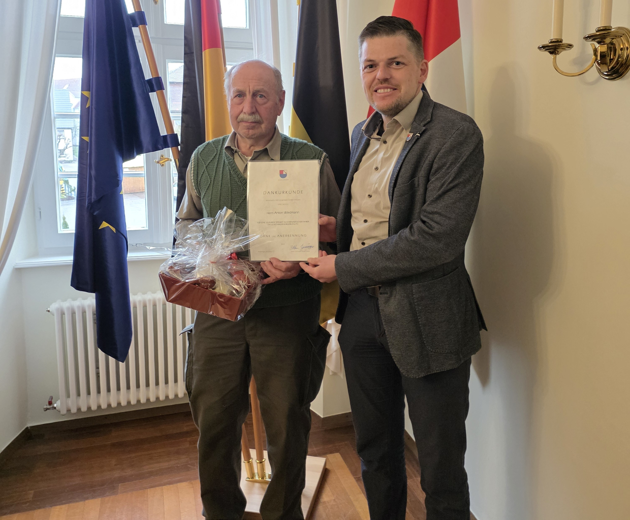 Im Rahmen des letzten Fahrertreffs wurde Anton Wiedmann aus den Reihen der ehrenamtlichen Fahrer des Bürgerrufautos verabschiedet. Anton Wiedmann war ein „Mann der ersten Stunden“ und seit mittlerweile zehn Jahren als ehrenamtlicher Fahrer aktiv. Er hat sich in dieser Zeit durch sein großes Engagement, seine Zuverlässigkeit und Flexibilität ausgezeichnet und war stets ein gerngesehener Fahrer für viele Nutzer des Bürgerrufautos. Bürgermeister Stefan Jenninger verabschiedete Anton Wiedmann mit einer Dankurkunde und einem kleinen Präsent aus dem Fahrerkreis.