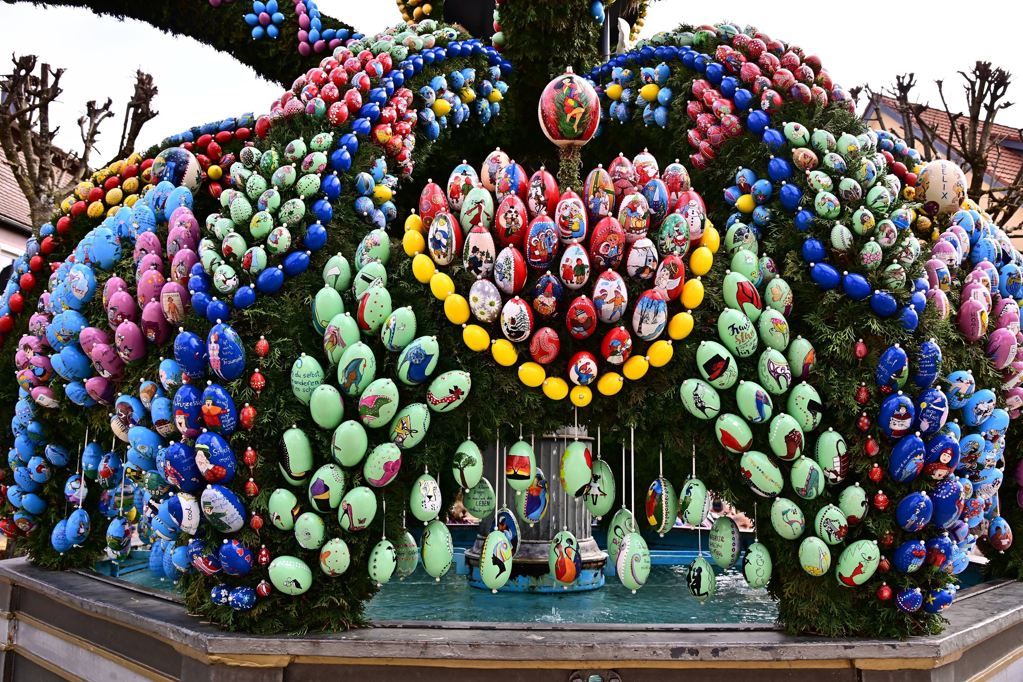 In Schechingen wird der Marktplatzbrunnen zur Osterzeit für ca. 3 Wochen mit über 12.000 echten und handbemalten Hühner-, Gänse-, Straußen- und Wachteleiern geschmückt und der Öffentlichkeit kostenlos präsentiert. Inspiriert von einem Ausflug unserer Seniorengemeinschaft „Treff ab 60“ in die fränkische Schweiz entstand die Idee, unseren historischen Brunnen aus Dankbarkeit für das lebensspendende Wasser, aus Freude am Erwachen der Natur und zum Fest der Auferstehung Christi mit bunten Eiern zu schmücken.